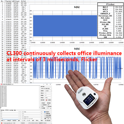 The CL300 illuminance meter has conventional measurement mode, continuous measurement mode, and high-speed measurement mode. In high-speed measurement mode, the instrument continuously tests the illumination of the light source at a testing speed of 3 milliseconds per test, and can further calculate the spectrum and Flicker of the light source. For detailed usage instructions, please consult technical support.