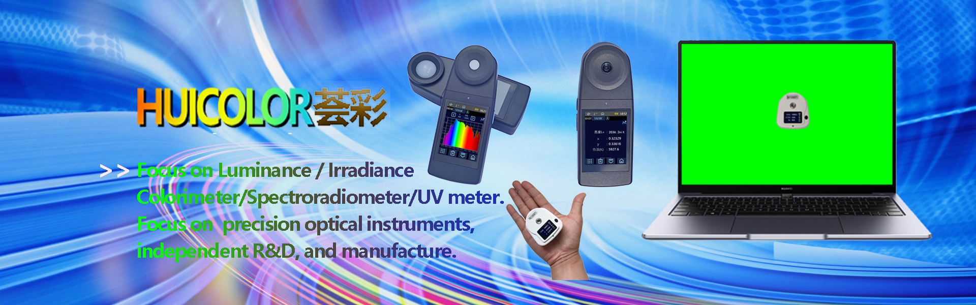 CI800 spectroradiometer is a portable luminance colorimeter, independently developed by Huicolor Company. The colorimeter uses a high-precision concave grating as a spectroscopic component, which can collect the wavelength 350~800 nm, It outputs 1 nm interval radiance spectrum. The instrument has a measuring angle of 1 ° , a minimum measuring area of φ6 mm and a maximum measuring range of 200,000 cd/㎡.