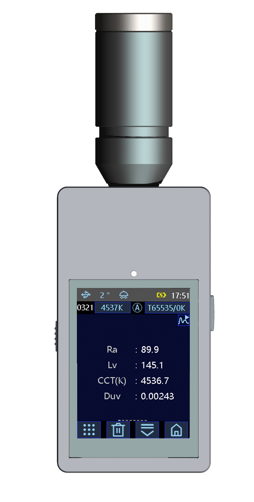 CI820 spectral luminance colorimeter stand-alone instrument can easily realize spectrum, Lv, color temperature, color rendering index, dominant wavelength, S/P, peak wavelength, plant lamp parameters, flash measurement, camera white balance and other parameters measurement.