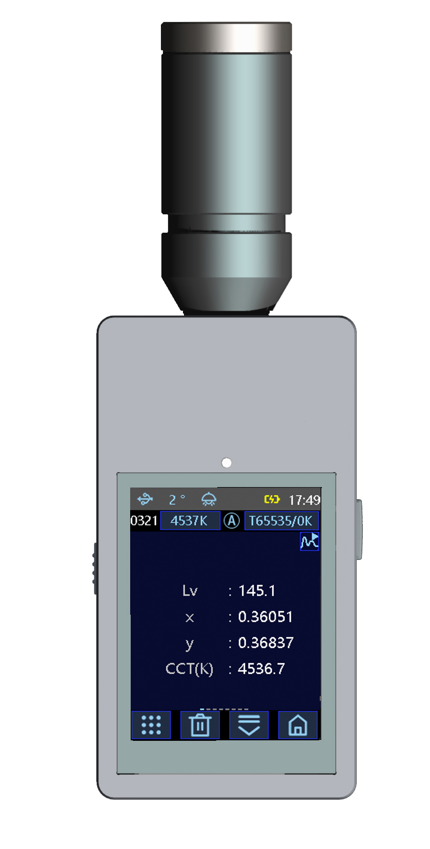 1. The instrument utilizes a high-precision concave grating as the spectral element and a 256-pixel CMOS as the detector. With a compact structure, it can measure the radiance spectrum of ambient light and flickering light sources within the wavelength range of 350-800nm, achieving high measurement accuracy, with a wavelength accuracy of 0.2 nm and a spectral output of 1nm. Compared with traditional XYZ filter color luminace meters, there is no adaptation error of CIE XYZ response function, and the measurement is accurate.