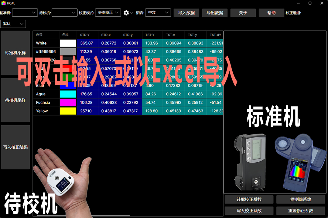 在这种情况下,可以用荟彩公司提供的免费HCAL色彩校正软件对该类型的照度计/亮度计用进行校正,如果校正合理,测试该类型的面板样品,与标准机测试数据对比(美*达CA410,CS2000,CS3000,CL500A,拓*康的BM7,和HUICOLOR公司的光谱亮度计/照度计),校正后的照度计/亮度计通常亮度精度可以达到3%、平均色品坐标xy误差在0.003。