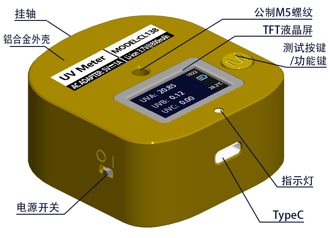☆ 测量指标:UVA (315~400nm), UVB (280~315nm), UVC (100~280nm), 温度;