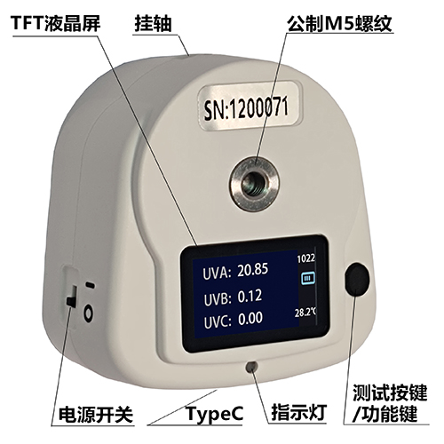 ☆ 测量指标:UVA (315~400nm)、UVB (280~315nm)、 UVC (100~280nm)、温度;